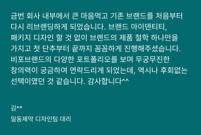 소비자는 브랜드가 어떠한 메시지와 정성으로 만들어졌는지, 그렇지 않은 브랜드는 무엇인지 단번에 알아차립니다. 비포브랜드는 고객의 니즈를 누구보다 빠르게 파악하고, 고객의 비즈니스를 경험하는 소비자의 인식과 공감을 바탕으로 신박한 기획 능력과 독보적이고 양질의 디자인을 통해 브랜드를 넘어 하나의 문화를 제공합니다.